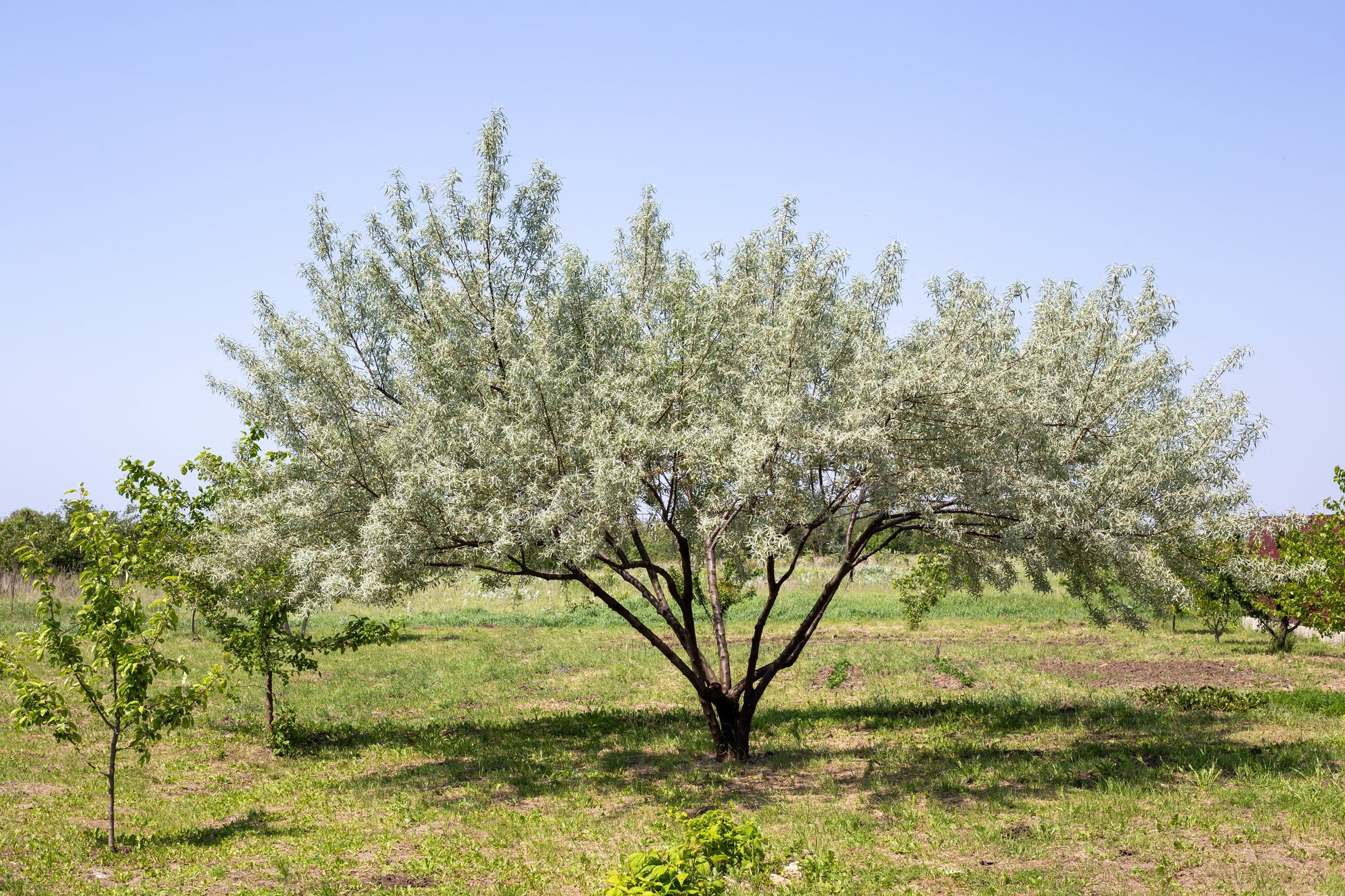 OTHER: The American Silverberry is a super cold hardy deciduous shrub to small tree that is native to the Northern US & Canada. Naturally, they have a more shrub-like stature, but take to pruning well & can be sculpted into a tree with little effort. Silverberry plants are tolerant to a variety of conditions including coastal (salt & wind), drought, sandy or rocky soil, heavy clay soil, & nutritionally poor soil. They can even help to fix the nitrogen in the soil. The thornless Silverberry is fast growing & long lived, & will spread by rhizomes to form colonies without being at all invasive.