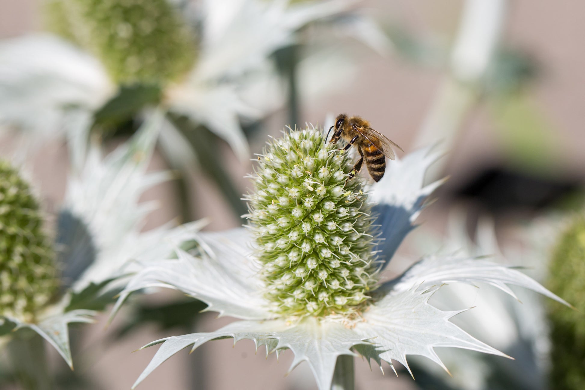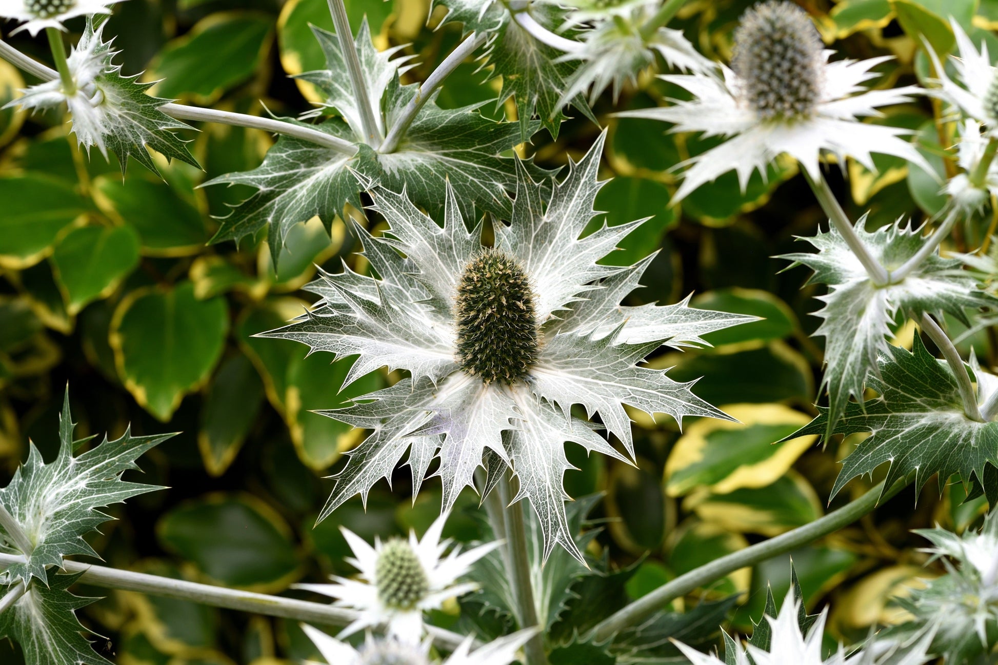 OTHER: Silver Sea Holly has conical flowers that start out green, blooming in unique steel blue shades. They are surrounded by thistle-like silvery white bracts that really stand out & shine in the garden. The flower heads are very showy, measuring as much as 4 – 6” wide, & they will attract bees & butterflies. They stand above an evergreen basal rosette mound of heart shaped leaves. Sea Holly has a long bloom time, & make a wonderful dried flower either left in the garden for winter interest, or cut for a dried floral arrangement.