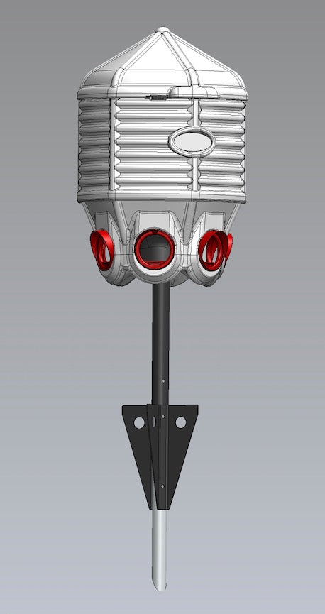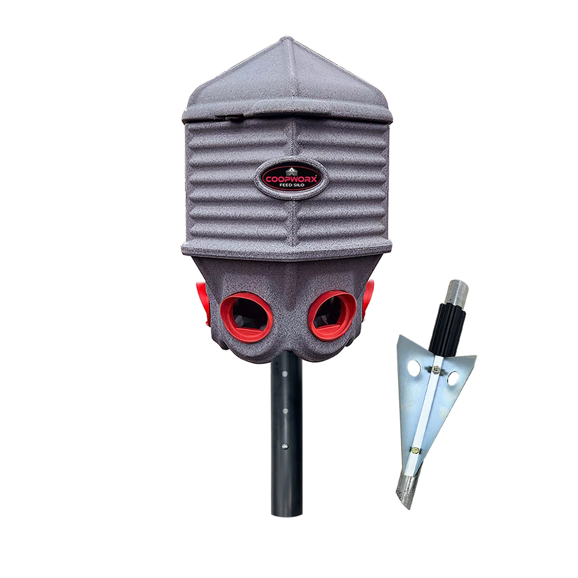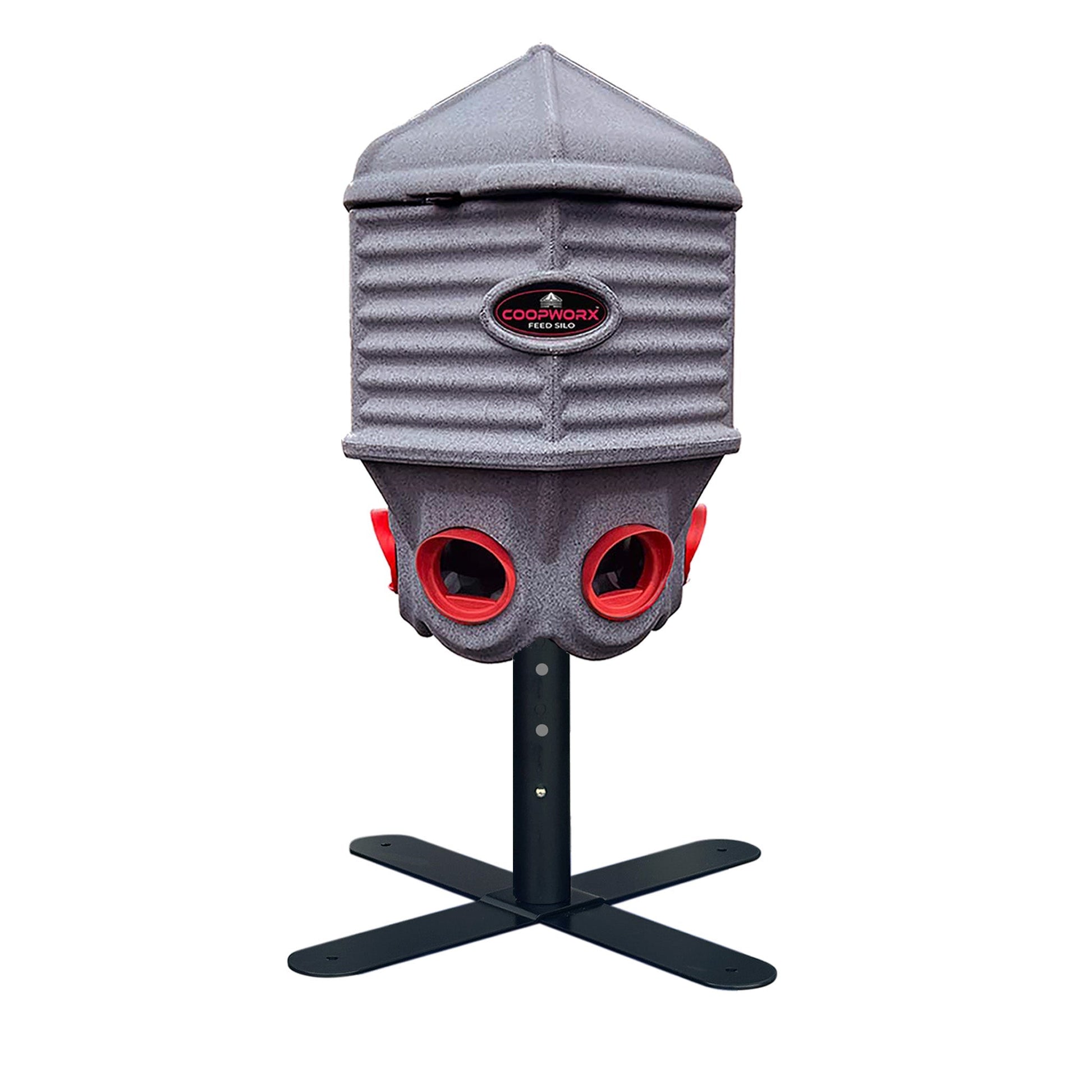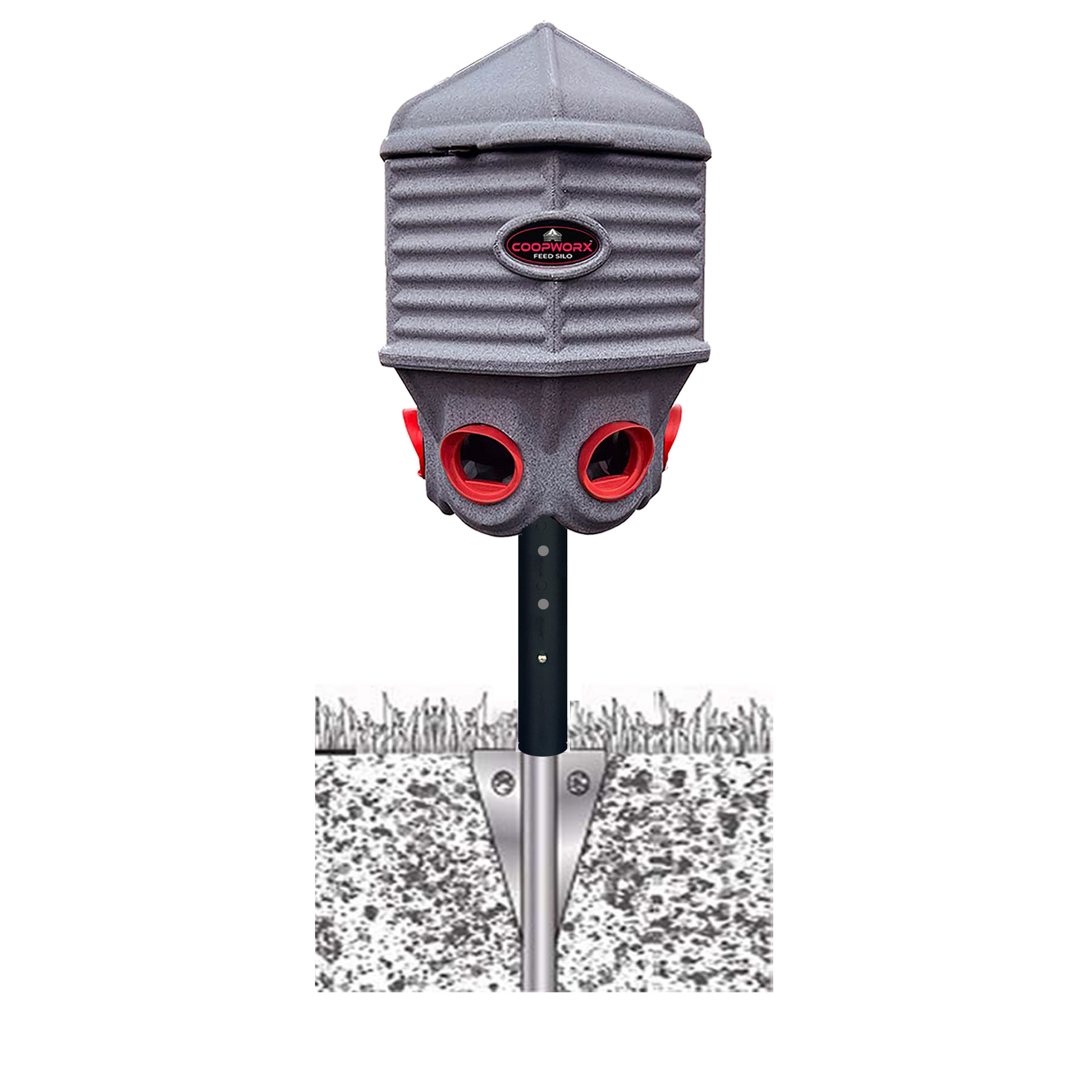 Engineered for durability, the CoopWorx Feed Silo II mounts to a single post and features six "soft touch" feed ports, integrated drip edges and a roost resistant lockable hinged lid. (See mounting instructions below).