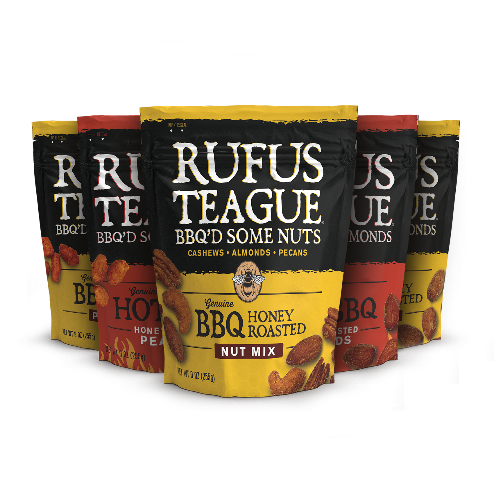 THE WHOLE LOT! Get all SIX varieties of Genuine BBQ Nuts. All are honey roasted and coated in either Rufus’ legendary Honey Sweet or Blazin' Hot BBQ goodness. Each comes in a stay-fresh pouch that’s resealable, as long as you can force yourself to stop eating long enough to zip it.