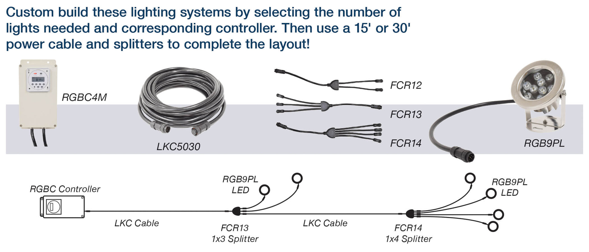 Custom build a lighting system by selecting the number of RGBW fixtures. Then use 15′ or 30′ power cable and splitters to complete the layout to the controller.