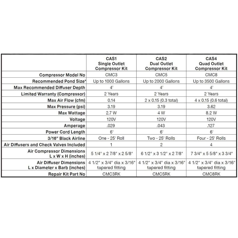 - Kit includes compressor, black vinyl tubing, airstone diffusers and check valves