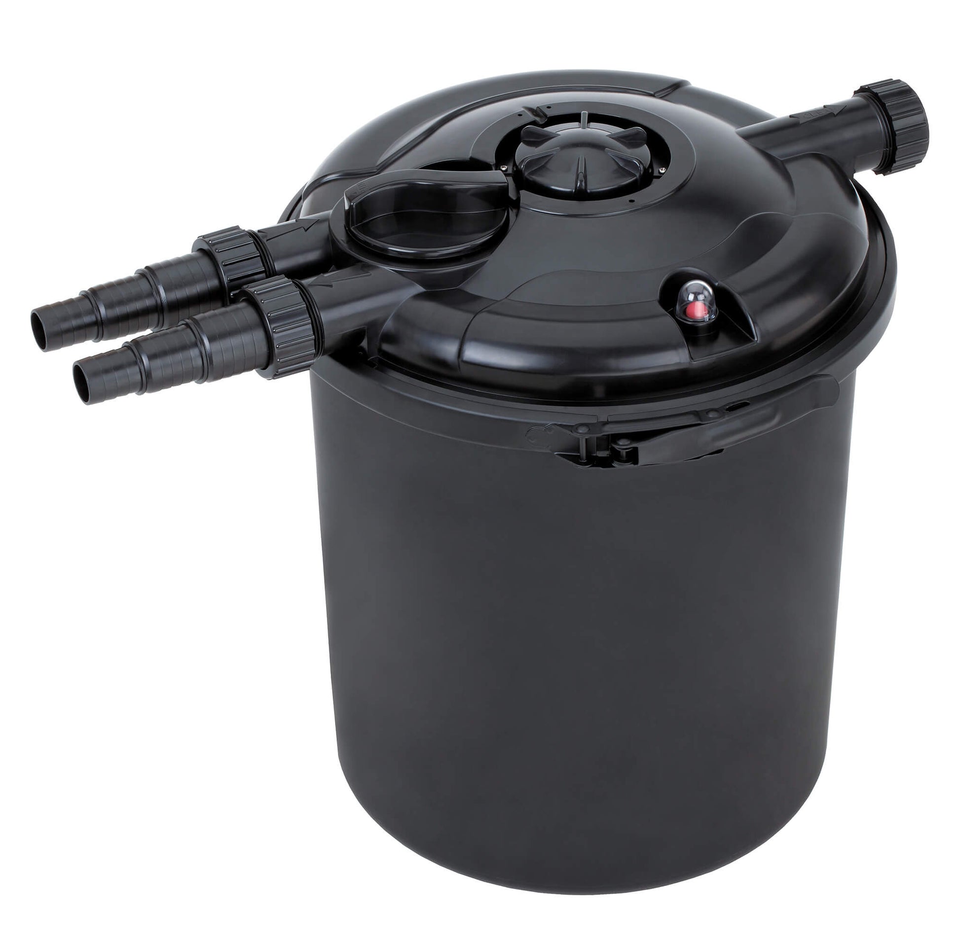 Overall, this pressurized filter provides mechanical and biological filtration, and with optional UV treatment, it ensures cleaner and healthier pond water for the specified size.