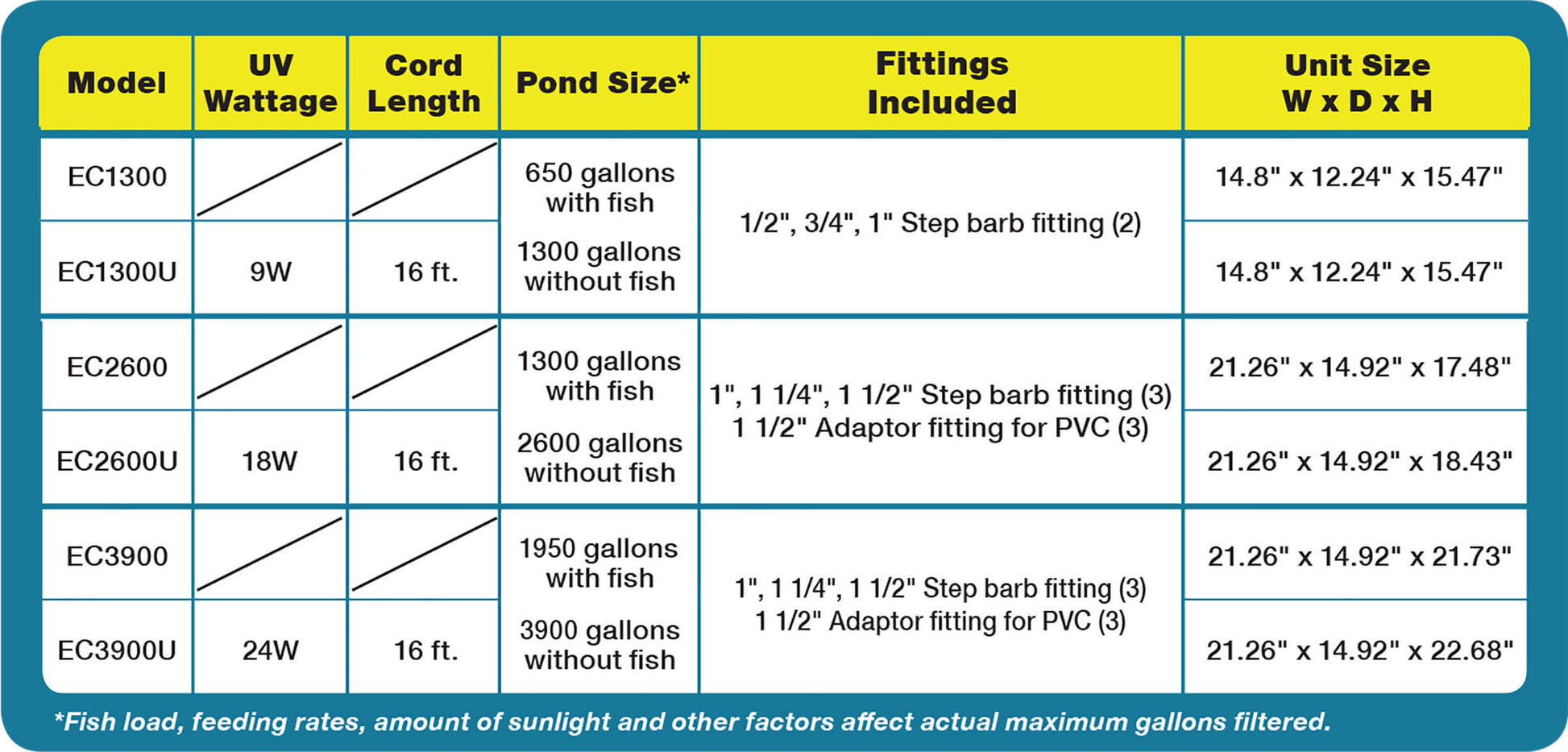 The EC2600U Eco-Clear Pressurized Filter is an upgraded model capable of handling ponds up to 2600 gallons (or 1300 gallons with fish) and is equipped with an 18-watt UV light for enhanced water clarity. Here are its notable features: