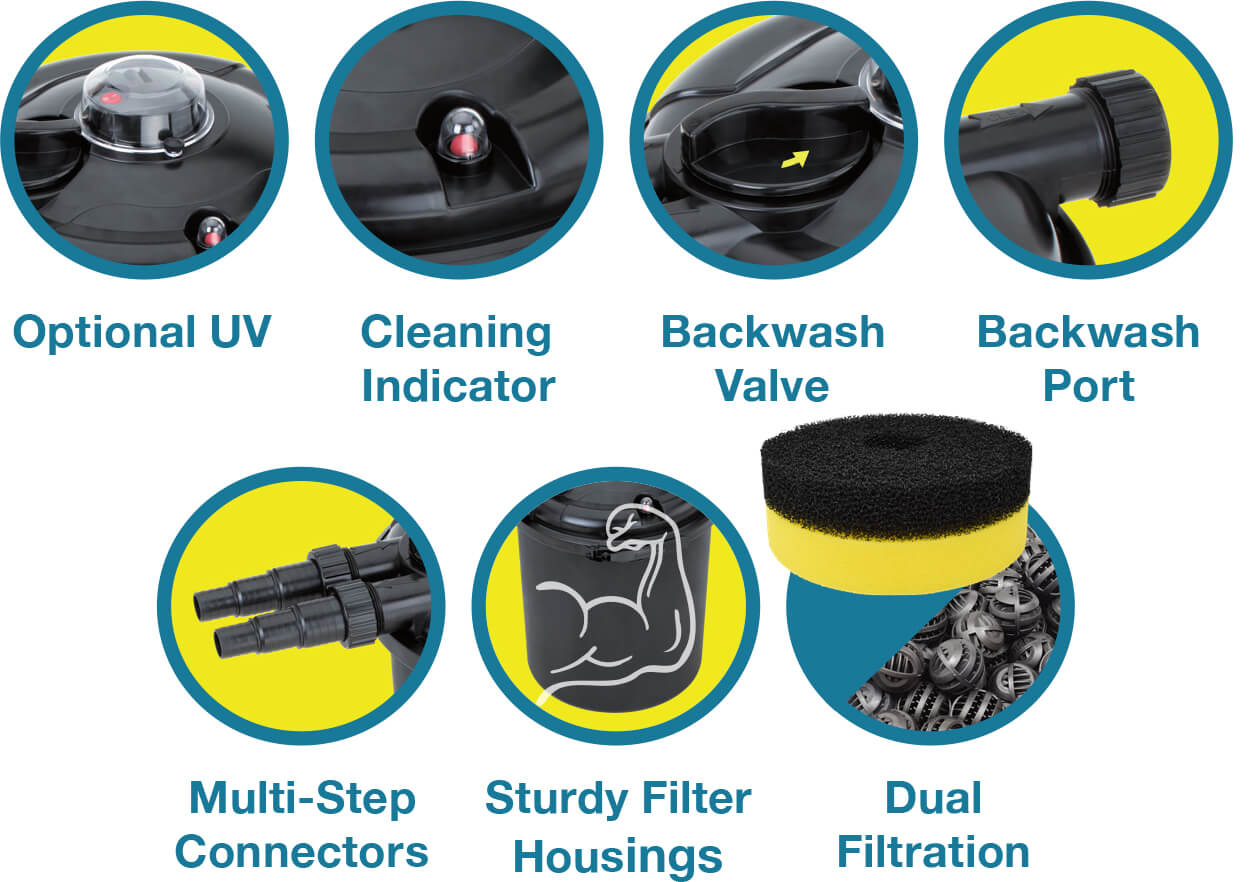 In summary, this pressurized filter provides mechanical and biological filtration, and the integrated UV light option ensures improved water clarity by targeting algae cells, making it suitable for ponds up to 2600 gallons.