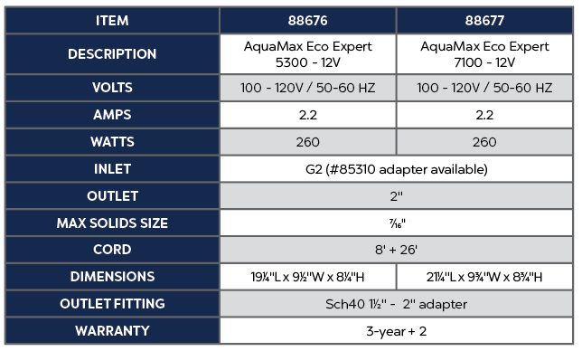 The AquaMax Eco Expert 11500 has 220-240V / 50-60 Hz, 3.5 amps and a 2” outlet. It has a 33’ power cord, dimensions of 21”L x 9.75”W x 8.75”H and a Sch40 1.5”-2” adapter. The AquaMax Eco Expert 11500 has a max flow of 11500 GPH and a 5-year warranty.