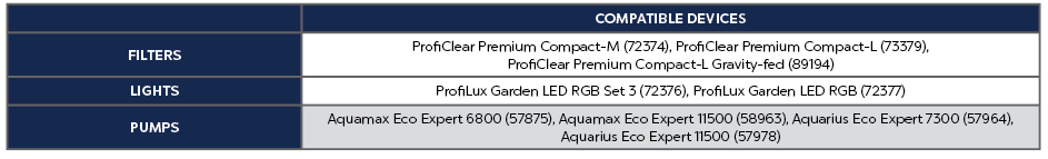 EGC-enabled filters, pumps and lights are directly linked to the EGC Cloud Controller with Connection Cables and controlled by the OASE Easy Control application