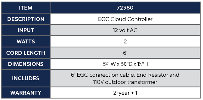 The OASE Easy Garden Control system operates and monitors EGC devices via WiFi application, either locally or over the internet. EGC-enabled filters, pumps and lights are directly linked to the EGC Cloud Controller with Connection Cables and controlled by the OASE Easy Control application. The free Easy Control app individually reads and regulates any combination of up to 10 EGC pumps, filters or LED controllers on any Apple or Android platform. For local control of the hardwired network within 260’ of the Cloud Controller, the OASE Easy Control application connects directly to the Controller. Controller mounts conveniently on a wall or in the ground with included stake and mounting hardware. The controller housing has an IP64 waterproof rating allowing for all-season outdoor use. All component are individually controlled regardless of their location in the chain of devices. Includes a 6’ EGC connection cable, a 6’ power cable, an End Resistor and a 110V outdoor transformer. EGC Compatible devices connect to each other directly with Connection Cables and Connectors, as required. Start the beginning of the run with the EGC Cloud Controller. It doesn’t matter what order the devices are connected. Each device is individually addressable and controllable. An End Resistor in the last device will signal the end of the run to the Cloud Controller. Download the Android or iOS “OASE Easy Control” application and install to access the Cloud Controller in one of two ways. Select “Direct (Access Point)” on startup to connect to the Cloud Controller’s internal WiFi from anywhere within a 260’ radius. You may also connect the Cloud Controller directly to your home router for full internet access. Once set up, simply go to the OASE Cloud Portal on any internet enabled device-phone, tablet or computer- to control devices, receive notifications and monitor equipment from anywhere in the world at oec.oase-livingwater.com. Optional router connection will continue to allow Direct Access within 260’. The EGC Cloud Controller is compatible with the Aquarius Eco Expert 7300, Aquarius Eco Expert 11500 with the ProfiClear Premium Filter Compact-M and the ProfiLux Garden LED RGB Set 3. The AquaMax Eco Expert 6800 and the AquaMax Eco Expert 11500 with the ProfiClear Premium Filters Compact-L and the ProfiClear Premium Filters Compact-L lights. The EGC Cloud Controller has a 12 volt AC input, a 6’ cord, dimensions of 5.25”W x 3.5”D x 1.5”H and a 3-year warranty.