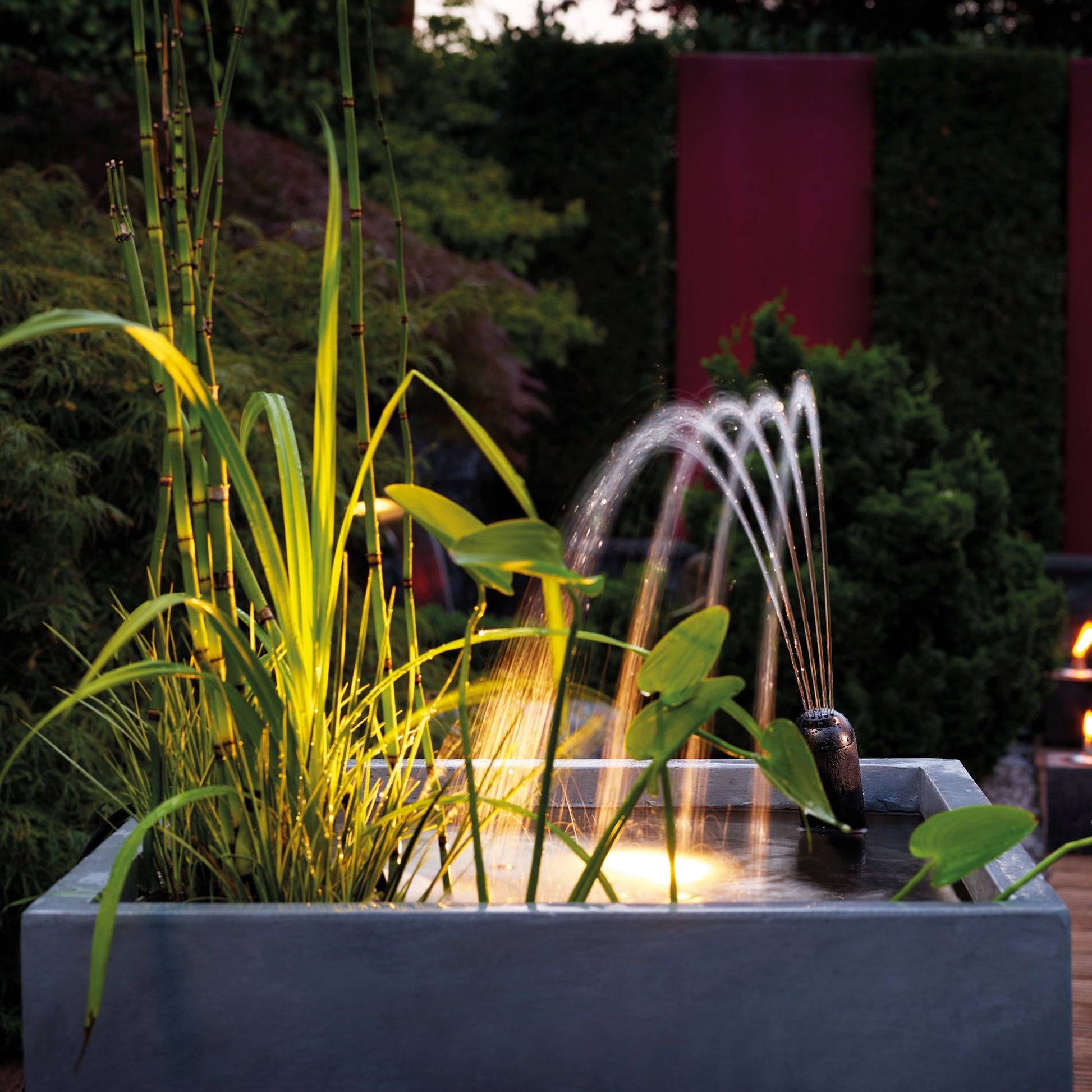 Pivoting telescoping nozzle extends 5", while built-in flow control and diverter valve can run an optional small secondary water feature using the included stepped hose adapter