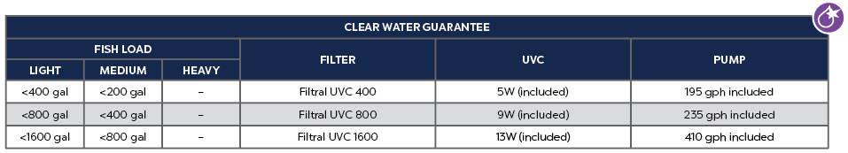 The Filtral UVC 1600 has a max head of 6' and is perfect for ponds up to 1,600 gallons. The Filtral UVC qualifies for the OASE Clear Water Guarantee. The nozzle patterns for the Filtral UVC are the Lava, Vulkan and Magma. The Filtral UVC 1600 has a light fish load of less than 800 gallons and a medium fish load of less than 400 gallons.