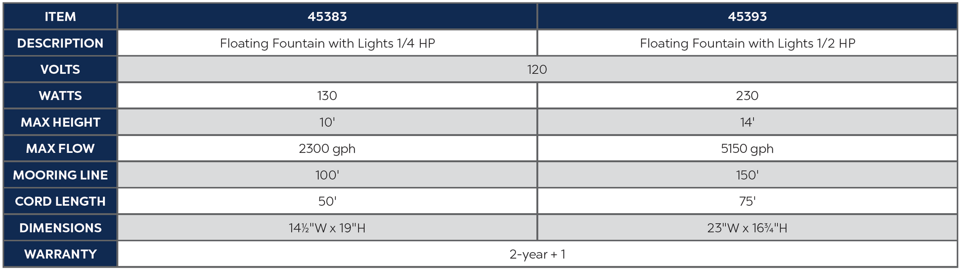 OASE’s Floating Fountains offer an economical shallow water aeration, combined with an attractive visual display. The Floating Fountain with Lights are compact, reliable and energy efficient and they come complete and ready to connect right out of the box! They are designed for use in smaller water features with a minimum depth of 30”, with dimensions for the 1/2 HP at 23”W x 16.75”H. The 3 LED spotlight illumination set brings the various water patterns to life after dark via optional photocell. With 3 ornamental nozzle attachments to choose from; Trumpet, Single Tier and 3-Tier, you’ll be amazed both day and night! The Trumpet Nozzle has a max size of 23'W x 5'H and is adjustable. The Single Tier Nozzle is 28'W x 12'H. The 3-Tier Nozzle is 9'W x 12'H. The grounding plate eliminates any chance of a stray current entering the water for unparalleled safety. The Floating Fountains coated magnetic rotors are impervious to adverse water conditions. The self-cooling, debris flushing rotor chambers help keep the pumps from overheating in the most demanding applications. With a tool-less volute removal, it makes maintenance fast and easy! The Nylon jacket on power cord keeps the line from tangling. The Floating Fountain with Lights includes a pump, float body, mooring lines, pump shield, stainless steel mooring anchors, lights and 3 nozzles.