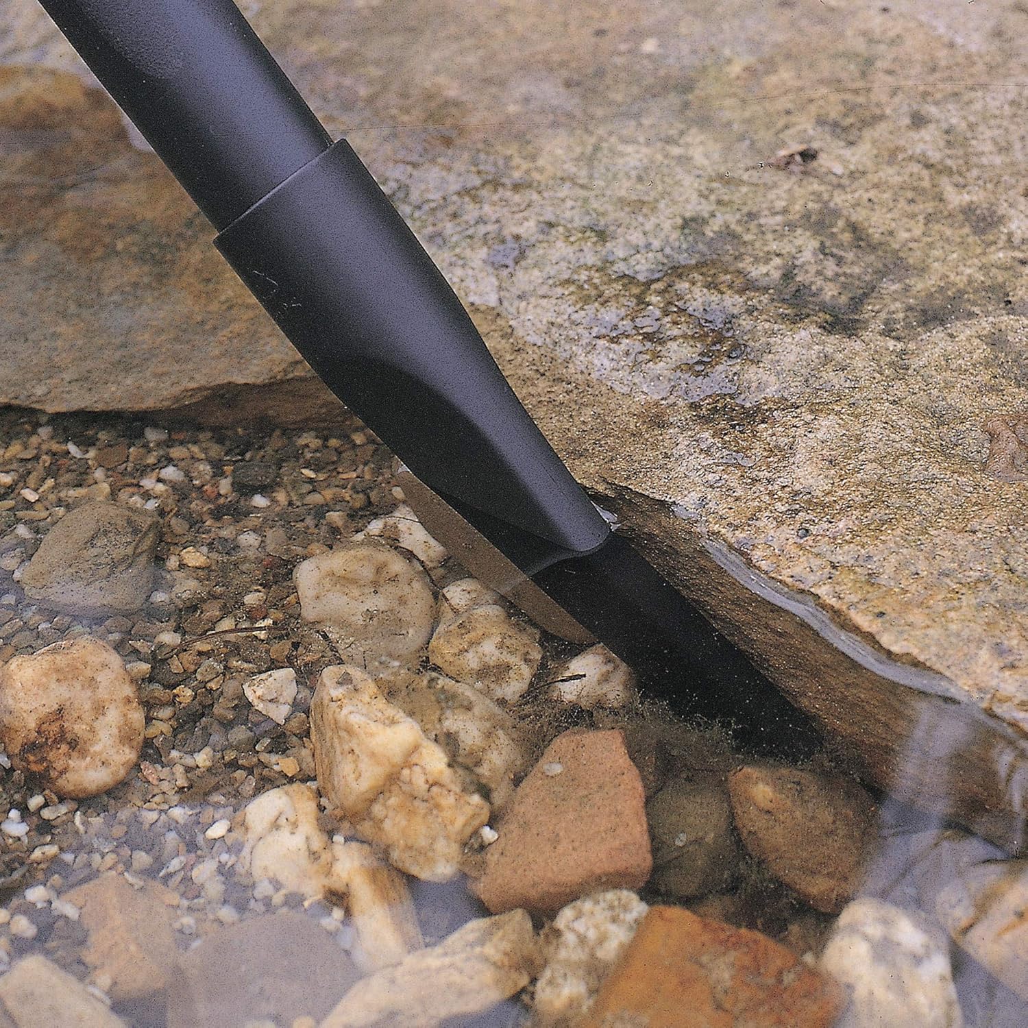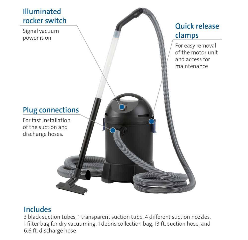 The Oase PondoVac Classic is perfect for cleaning small water features, ponds and spas. Using a single-chamber suction system, the vacuum fills with material removed from the pond and then automatically shuts off via an internal float and drains via gravity. With a suction capacity of up to 800 GPH, the vacuum will typically fill in 20-40 seconds and then discharge in 20-30 seconds. This type of vacuum will require some patience due to the on/off cycle. Its compact design and built-in handle allow for easy movement and transportation.