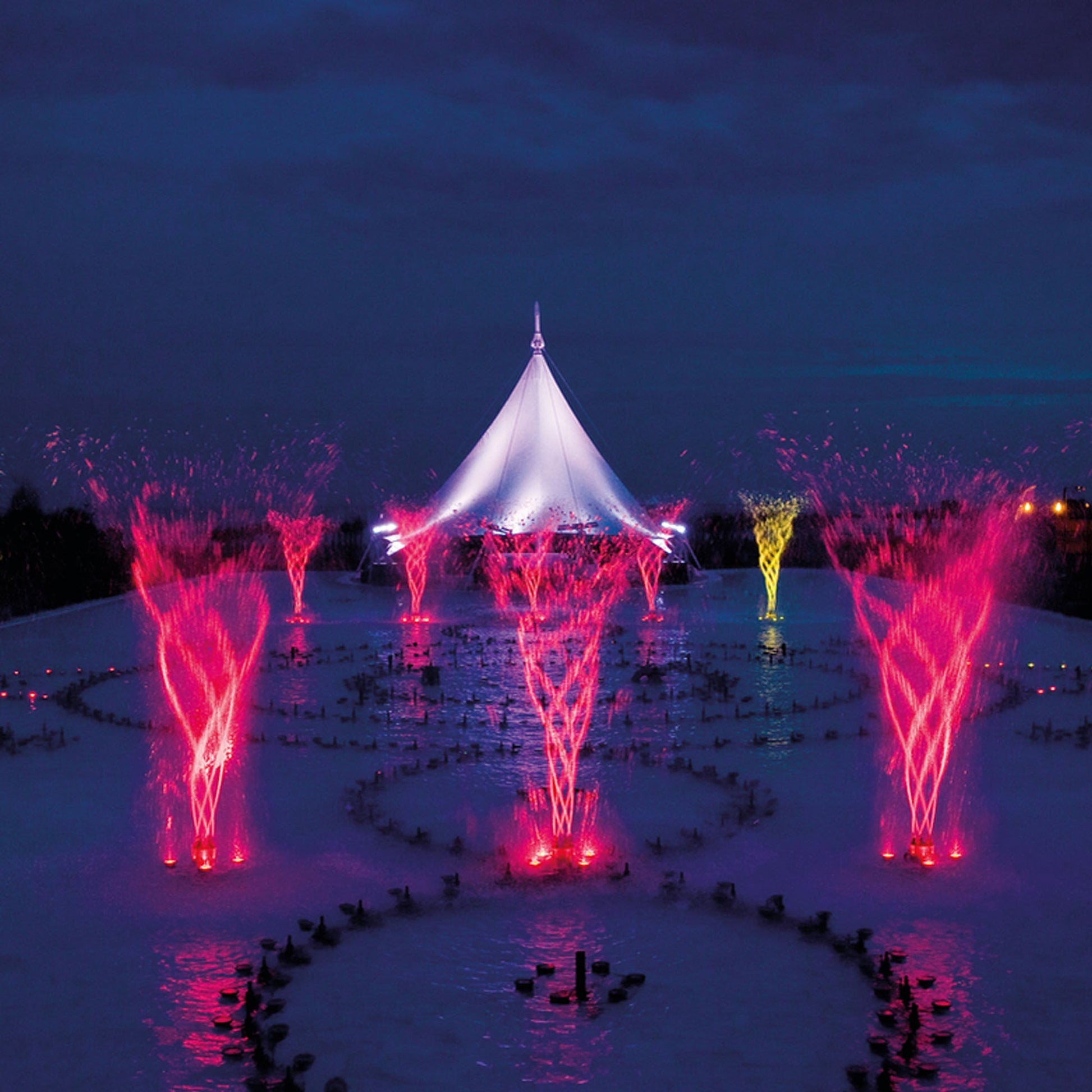 Rotating Nozzles create grace fully dancing fountains of rotating screw-shaped water patterns