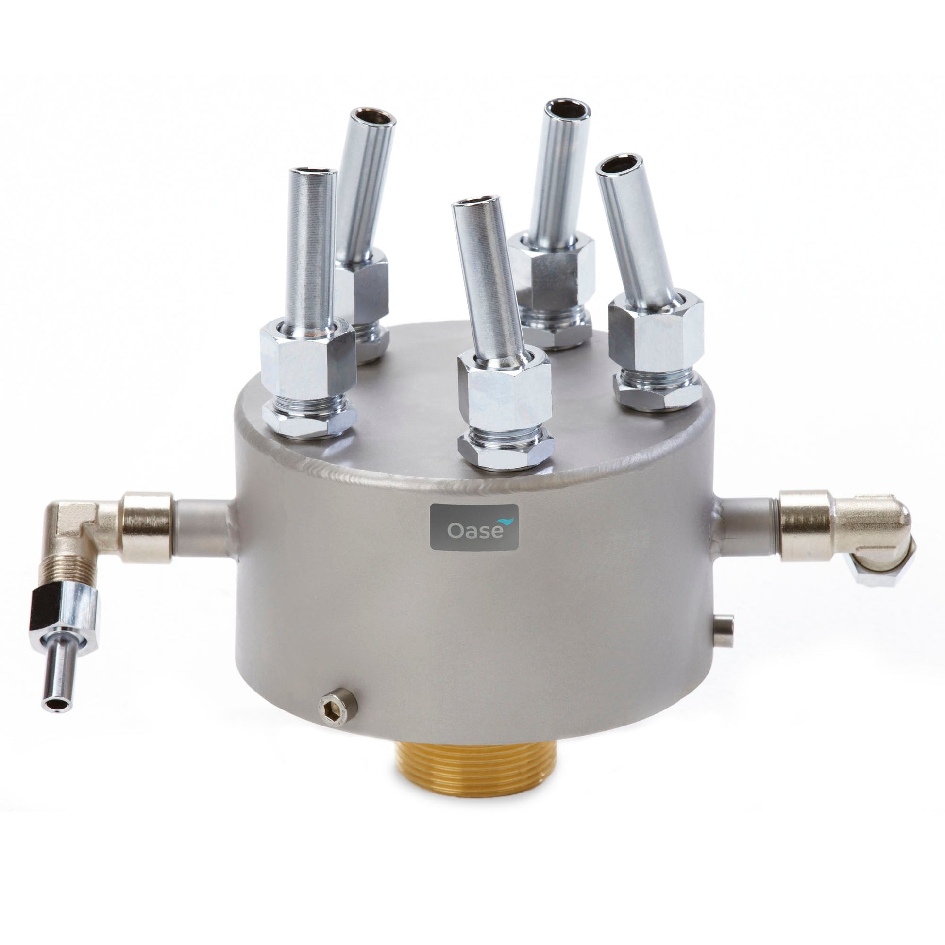 OASE Rotating Nozzles create gracefully dancing fountains of rotating screw-shaped water patterns. The 5 individual Comet Nozzles adjust for a wide variety of wind-stable water patterns. The diagonally set nozzles rotate with head on ball bearings.