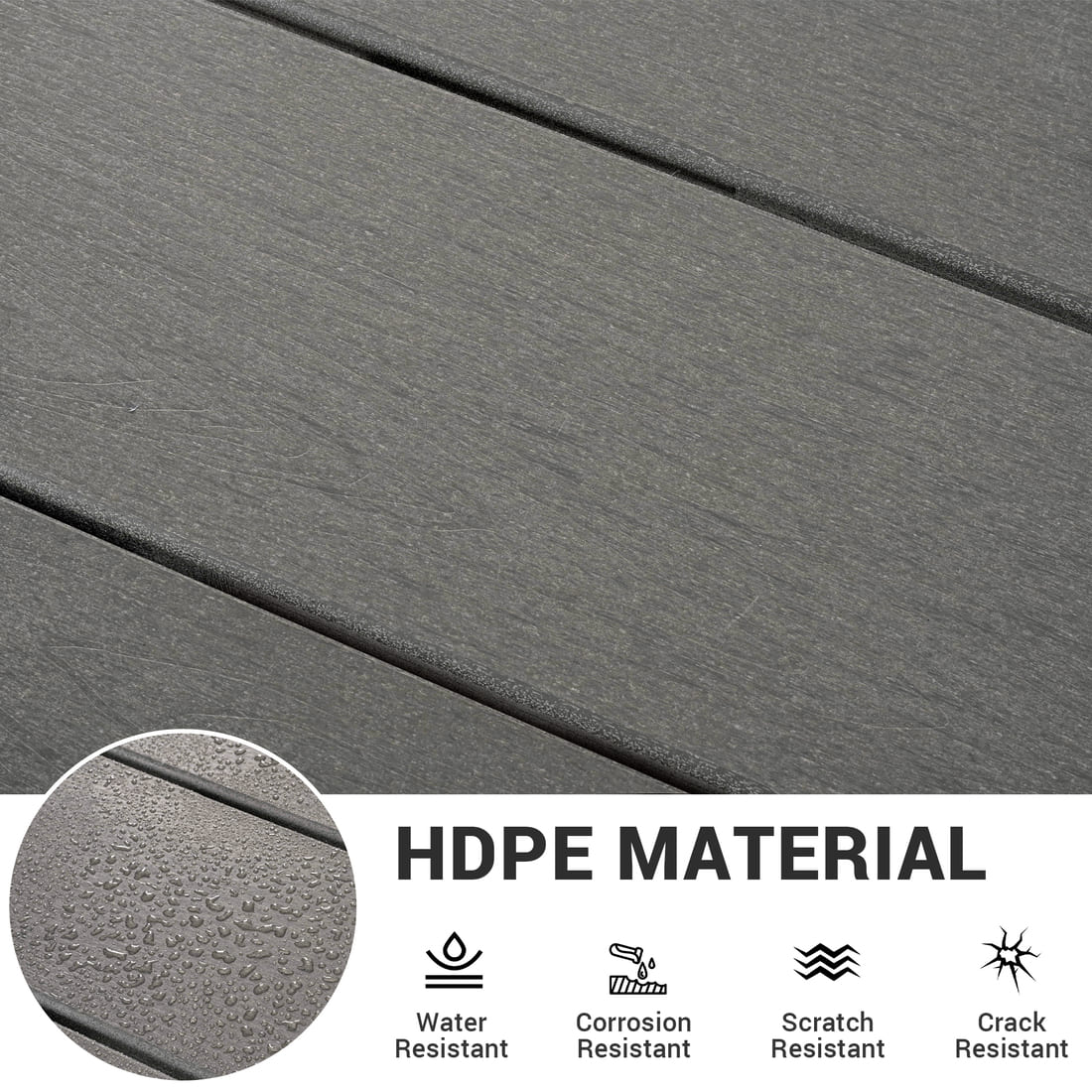 Crafted from marine-grade recyclable HDPE, this 6-seater withstandsextreme temperatures(-22°F~176°F) while maintaining its refined gray wood-grain finish. The 45"x28" table anchors the space with reinforced aluminum crossbars and a 1.7" umbrella port, while six armchair-style seats (each supporting 450 LBS) deliver lounge-level comfort through ergonomic curves and 3.2" thick seats.