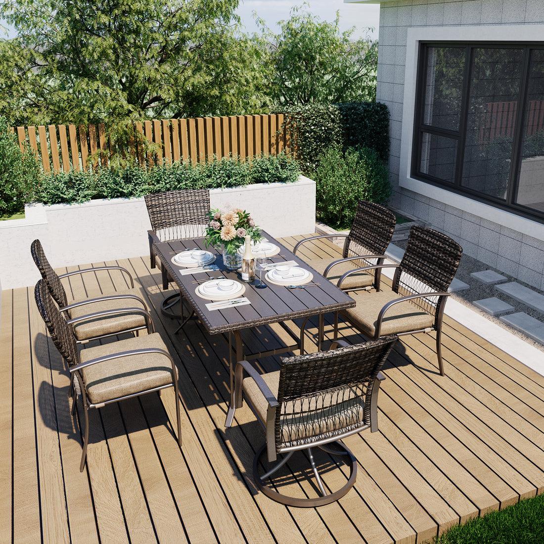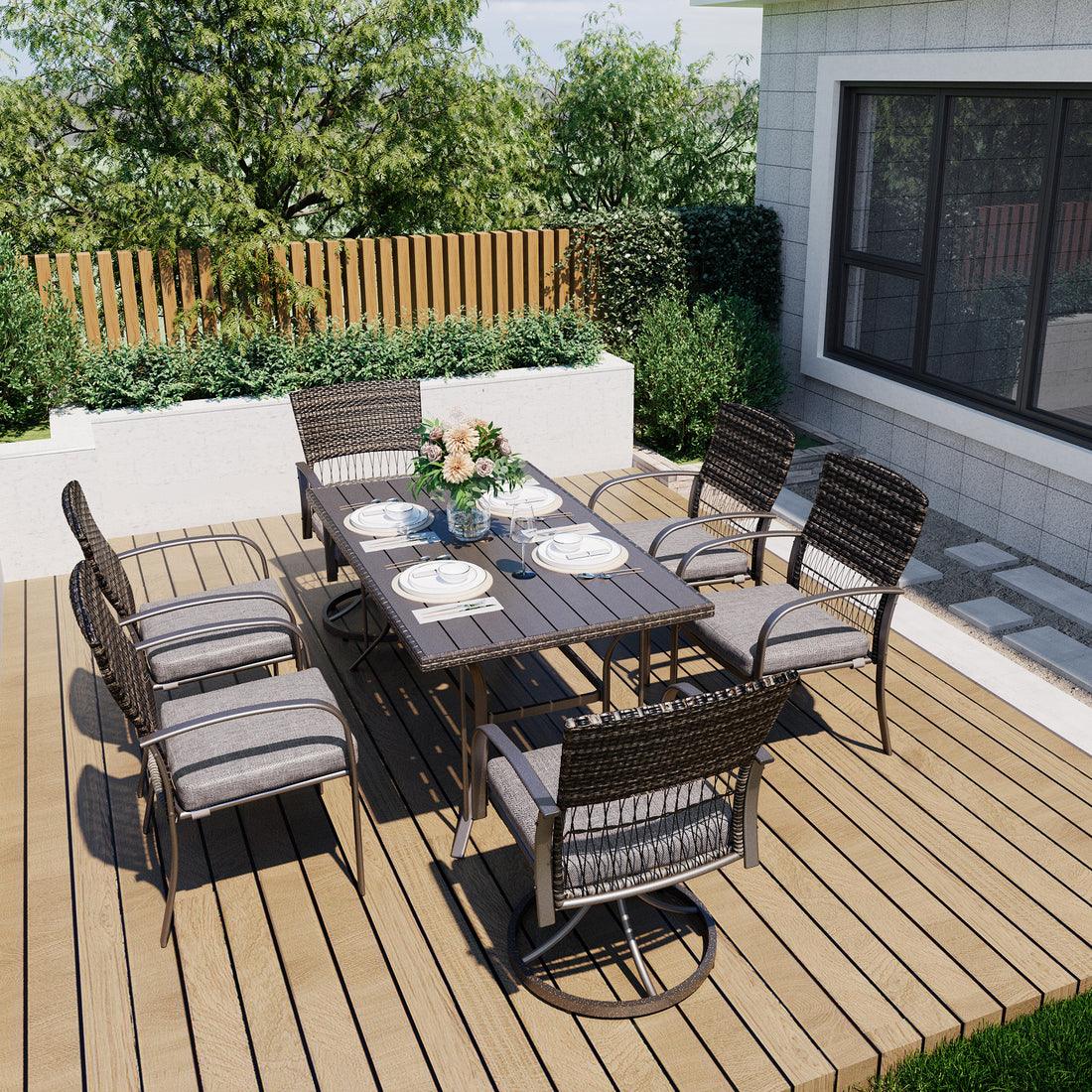 The powder-coated iron table withstands decades of pool parties, while 2 swivel chairs (360° rotation!) and 4 standard chairs adapt to any gathering—from family brunches to cocktail nights. UV-stabilized PE rattan resists fading, paired with 2.4” quick-dry cushions that survive ice cream spills and monsoon seasons alike.