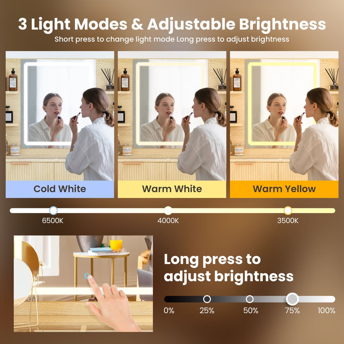 LED Mirror with Adjustable Lighting: The mirror includes 3 lighting modes—Cool, Warm, and Natural—with touch controls for brightness, perfect for makeup at home or in professional settings.