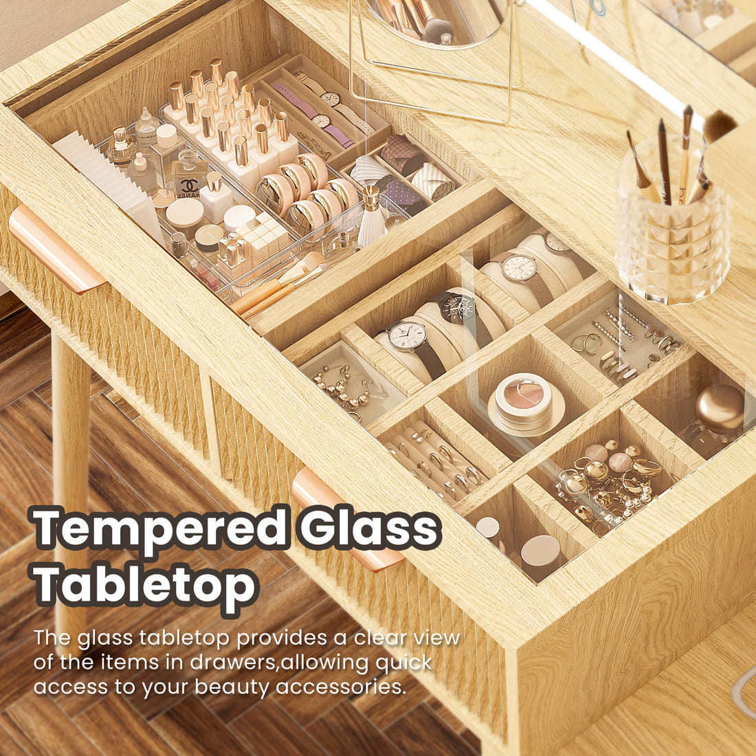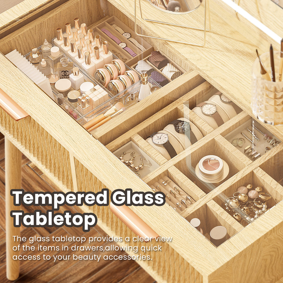 Unique Fluted Design: The fluted panels and gold handles add a luxurious touch, while the see-through drawer with 9 compartments and glass top makes it easy to store and view accessories.