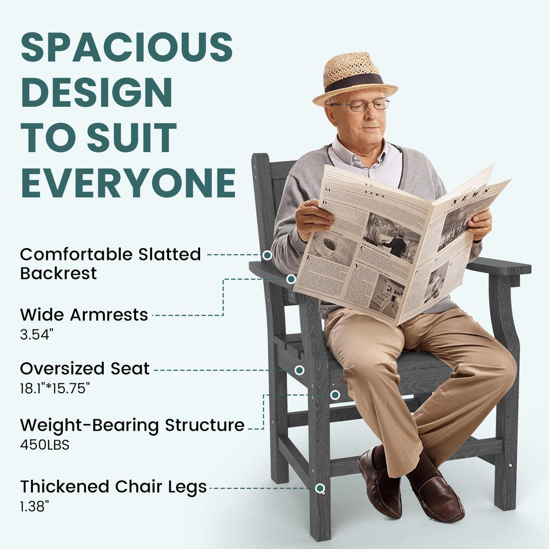 Crafted from recyclable high-density polyethylene, this gray wood-grain ensemble withstands extreme temperatures(-22°F~176°F) while maintaining its refined appearance. The 45" wide table comfortably seats four adults (450 LBS/chair) with ergonomic armrests and reinforced aluminum framing.