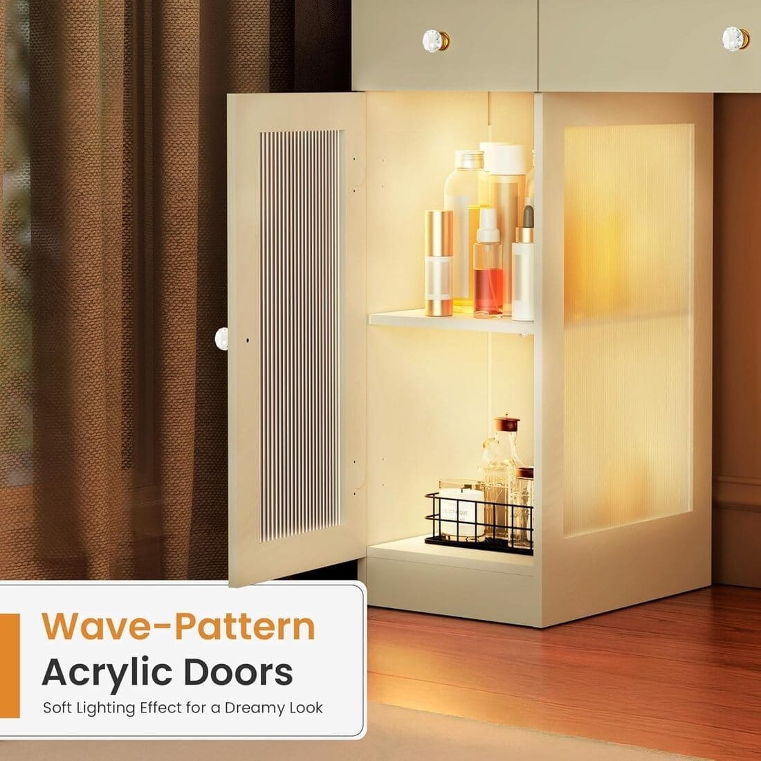 The 43.3" makeup vanity table Luxury has 3 drawers, 2 transparent cabinets and tempered glass top with crystal handles for elegant organization