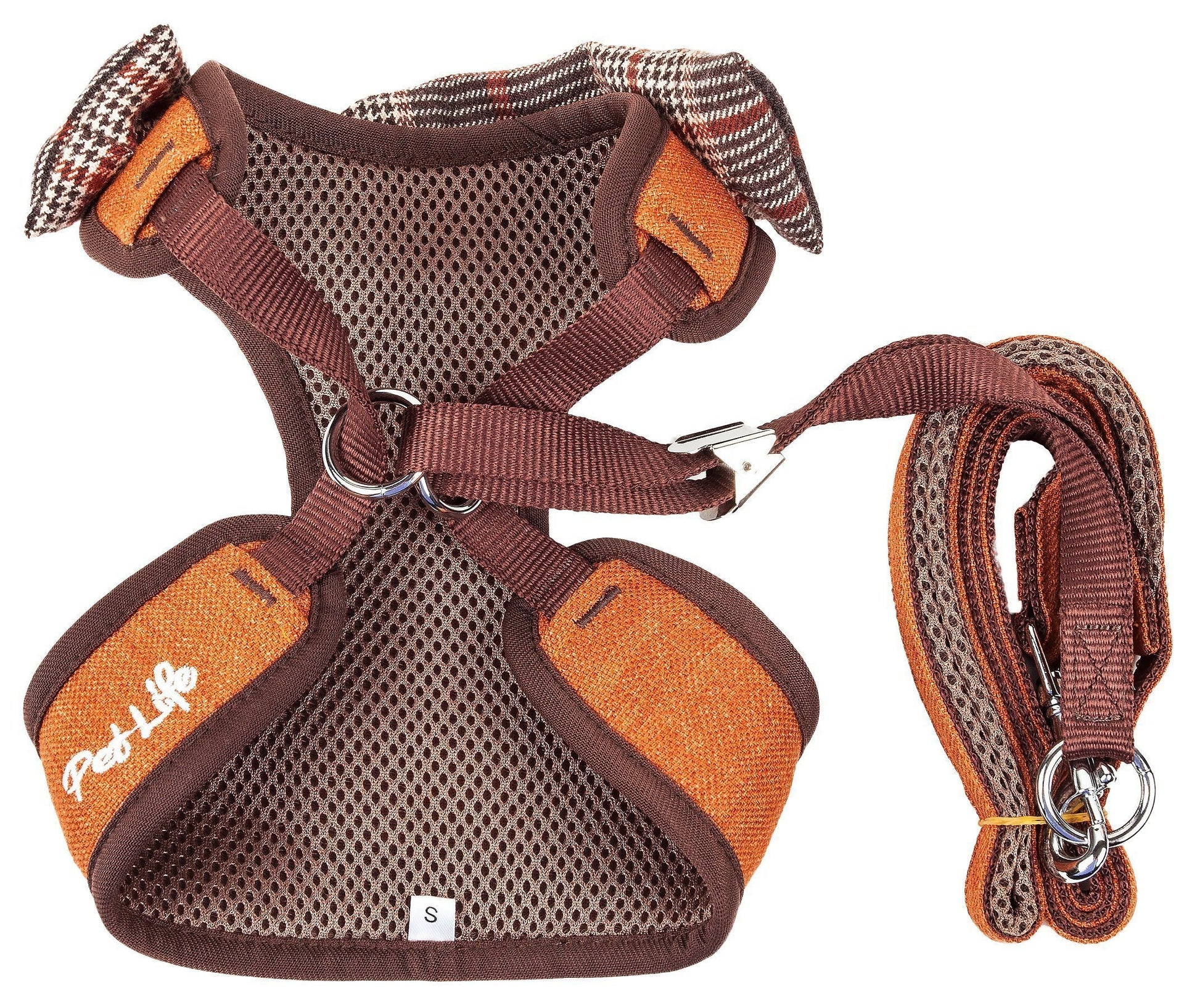 The Pet Life ® Luxe 'Pawsh' 2-In-1 Adjustable Fashion Dog Harness and Leash features a blended wool-like ventilated exterior and reversed with breathable accented Micro-mesh on both the coordinated Harness and Leash handle for premium comfort. The Harness features a well-coordinated magnificent Cocoa, Beige and Red wool tattersall Plaided Dog Bowtie that beautifully extends across the neck line that sits above a magnificient dark-tangerine or autumn colored body. The back of these dog harnesses feature a completely adjustable dual stainless steel hooks that connect to the swivel hook on the dog leash for multi-directional pull. The Pawsh harness was specially engineered to limit stress around the stomach by placing light stress around the sternum for proper comfort. Features reinforced stitching for durability. Available in Multiple Sizes.