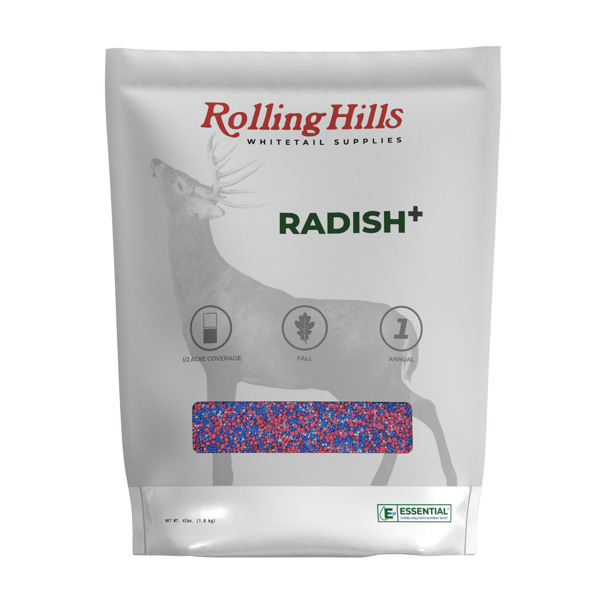 Our RADISH+ blend consists of Daikon Radish and Forage Kale-a powerhouse combo for killzones on your farm. Chosen by our agronomists to provide high palatability combined with impressive tonnage, for a preferred food source from late summer into the winter months. This blend was designed to be treated with our ESSENTIAL® HYDRO-HOLD with NUTRIENT BOOST coating, helping ensure early germination in drier conditions and a healthier seedling to make your plot a successful deer magnet.