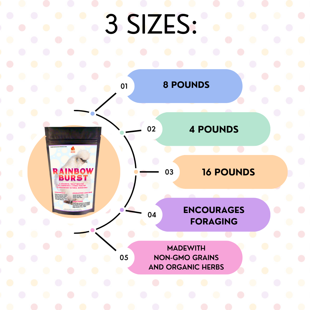 Rainbow Burst is a fun, colorful mixture made to encourage foraging and other natural behaviors. Your chickens will love foraging for the black soldier fly larvae, and love the colors of the herbs! Made with North American dried black soldier fly larvae (product of Canada), and USA-sourced corn, wheat, split peas, lentils, and organic herbs.