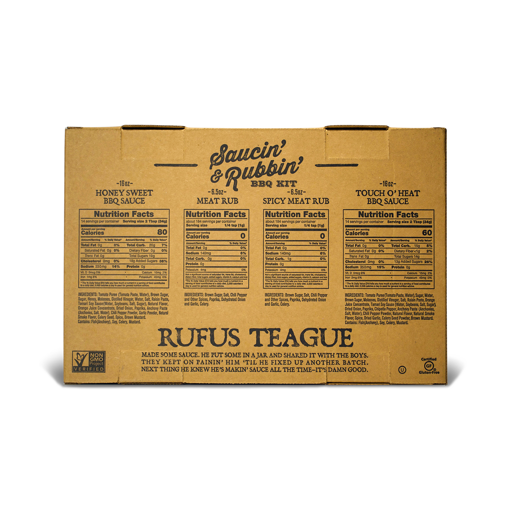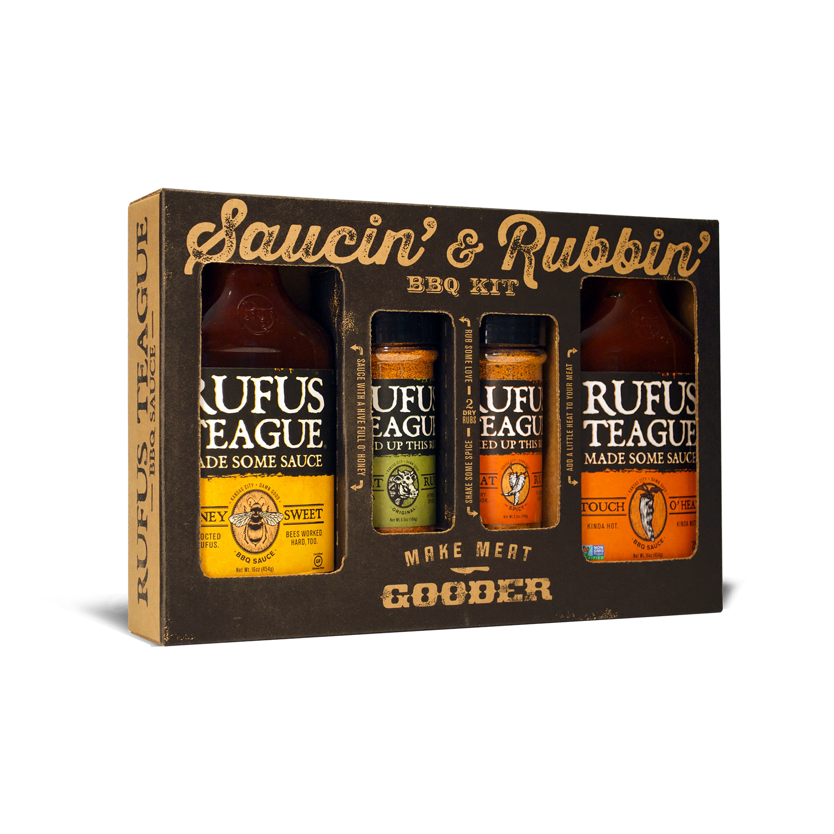 Give someone the gift of Rufus. All dolled up in this cool little box. You get one of each: Honey Sweet BBQ Sauce, Touch O' Heat BBQ Sauce, Meat Rub & Spicy Meat Rub. Damn, that's a great gift!