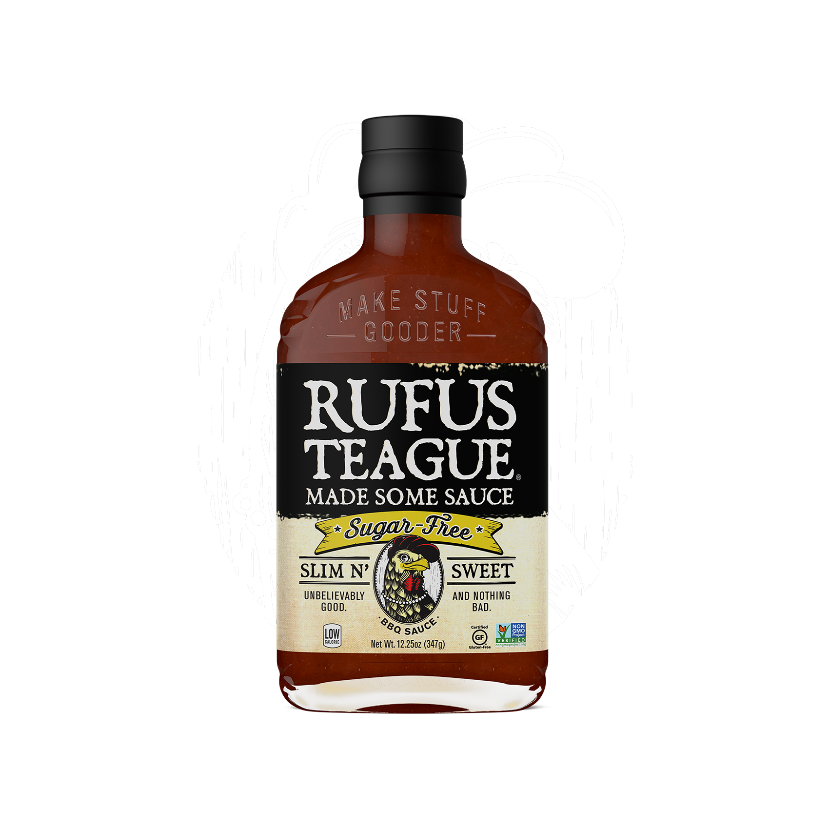 As with all Rufus Teague sauces Slim N’ Sweet is made with the finest natural ingredients. Sweetened with health-minded, all-natural Stevia and no sucralose or other artificial sweeteners. So, make your food happy and remember, “Good sauce makes bad barbecue good and good barbecue gooder.”