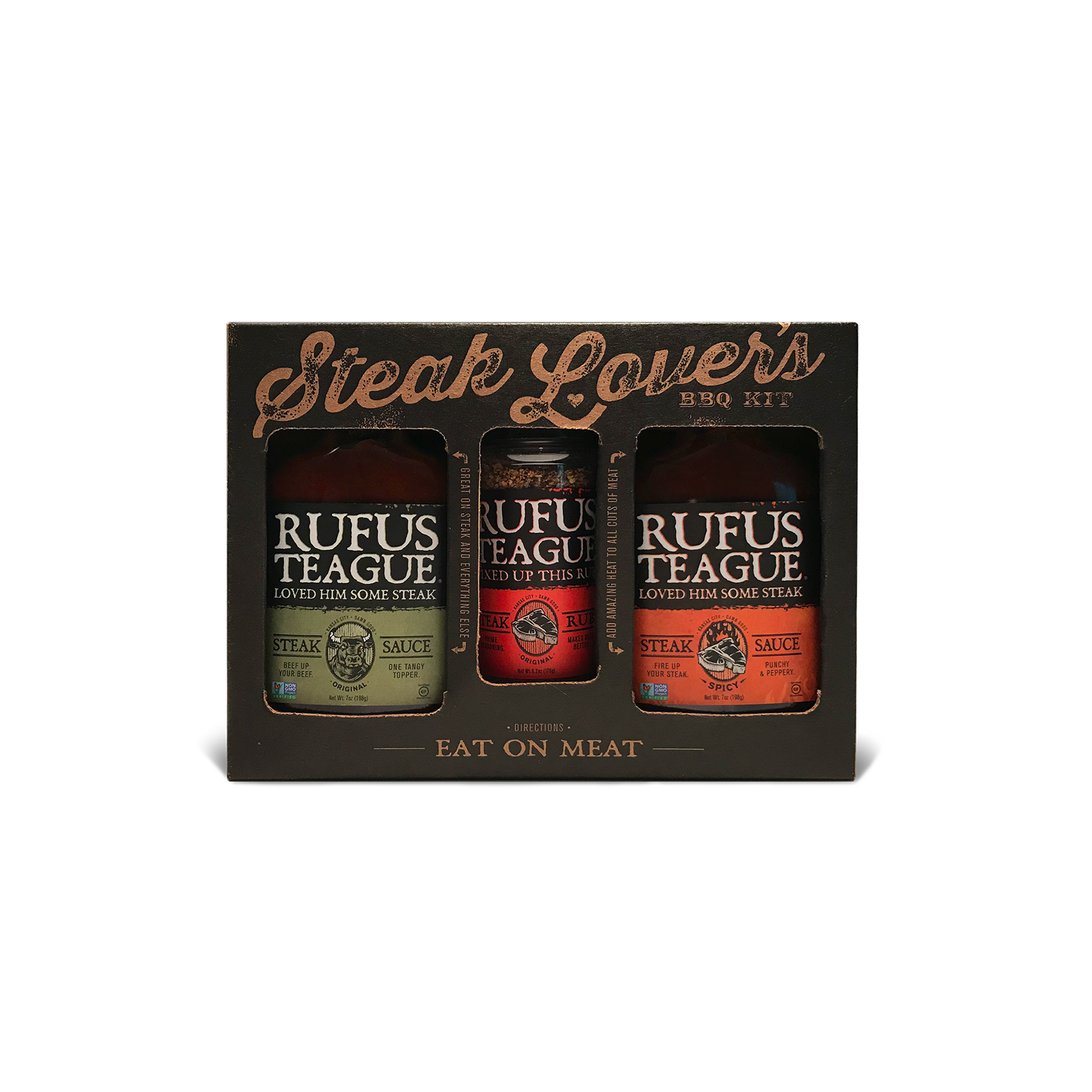 Rufus Teague knows that you don't mess with steak. So listen up if you think steak by itself is as good as it gets. This... gift kit... will... change... your... mind. Definitely not your typical grocery store steak sauce slop. Nope, these sauces are bold and bright and work on everything. And you also get a bottle of the most amazing spice your steak can handle. All in one kit!